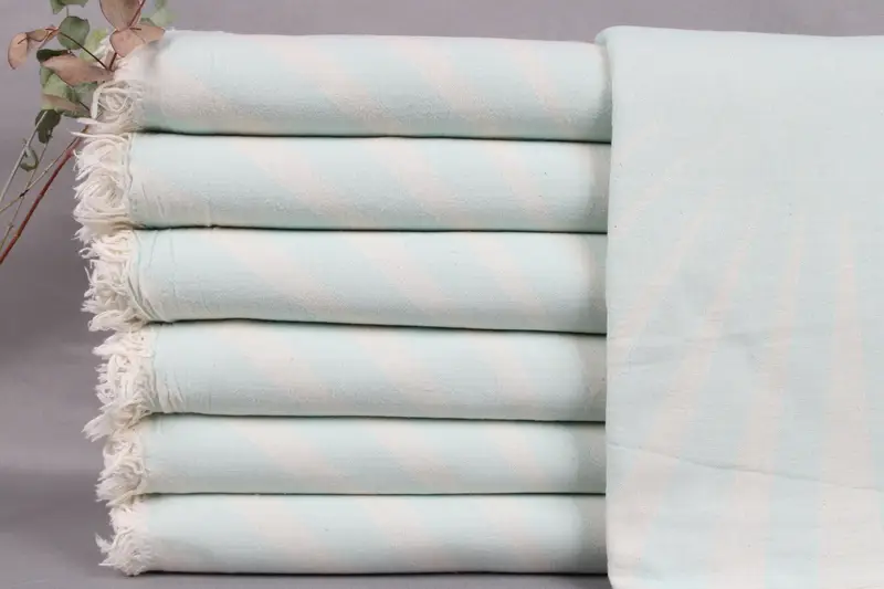 Woven from organic Turkish cotton, the beach towel exhibits a durable yet soft composition characterized by high absorbency. Resulting in a versatile textile, dimensions are 36x71 inches or 90x180 centimeters with a permissible weaving tolerance of ± 2 inches or 5 centimeters. Weighing 320 grams, these towels are meticulously hand-woven on looms.