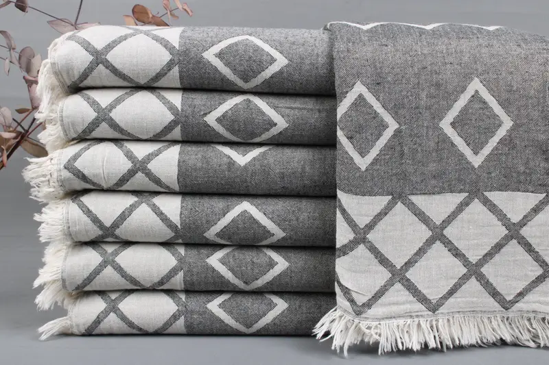 Fiber composition is derived from organic Turkish cotton, ensuring durability and softness. Characterized by dimensions of 40x70 inches or 100x180 centimeters, each towel exhibits a weight range of 425-475 grams. Weaving tolerances permit variations of ± 2 inches or 5 centimeters.