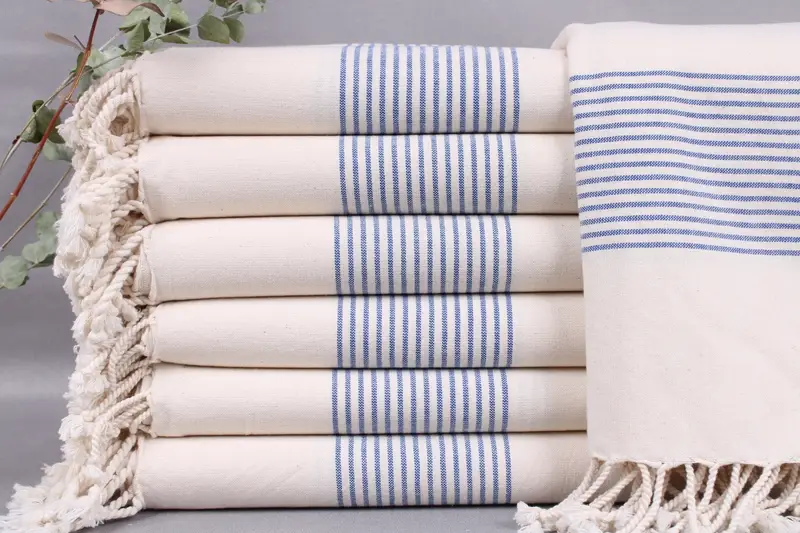 Each towel is woven from organic Turkish cotton, ensuring premium quality and exceptional absorbency. Resulting in a lightweight and durable product, the towels have a weight of 300 grams and a size of 40x67 inches or 100x170 centimeters, with a tolerance of ± 2 inches or 5 centimeters due to hand-weaving.
