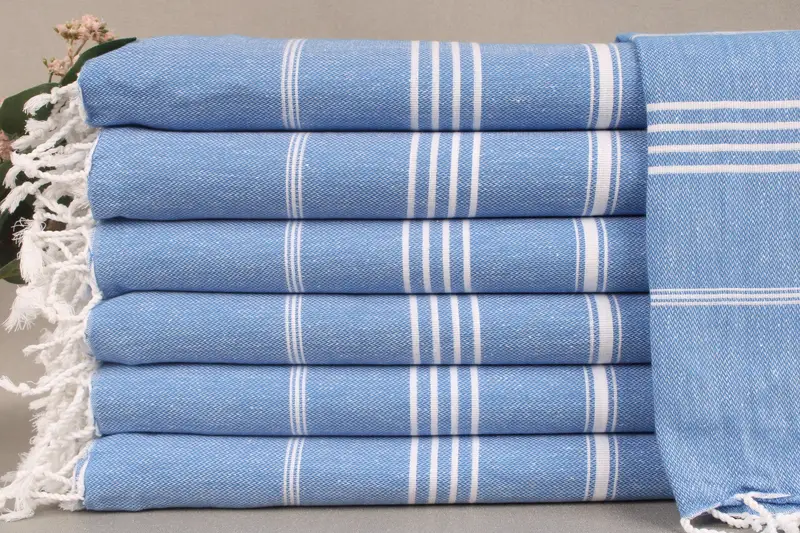 The product is woven from organic Turkish cotton, ensuring high absorbency and durability. Resulting in soft and robust towels, the dimensions are 71x40 inches or 180x100 centimeters. The towels are handwoven with a tolerance of ± 2 inches or 5 centimeters, resulting in a weight of 265 grams.