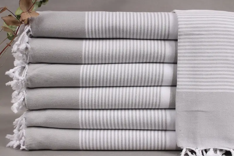 Handwoven Turkish towels are characterized by their high absorbency, ensuring efficient water retention. These towels, typically woven from organic Turkish cotton on traditional looms, measure 40x71 inches or 100x180 centimeters, weighing approximately 340 grams. Tolerances in size can result in variations up to ± 2 inches or 5 centimeters due to hand-weaving techniques.