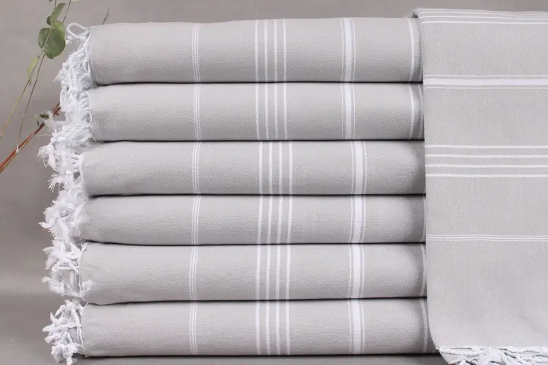 Turkish Beach Towels are woven from organic Turkish cotton, ensuring high absorbency and a luxurious handfeel. Characterized by a weight of 265 grams, these towels measure 40x71 inches (100x180 centimeters) with a tolerance of ±2 inches (±5cm). Handwoven on looms, each piece may exhibit slight variations, resulting in a unique textile.