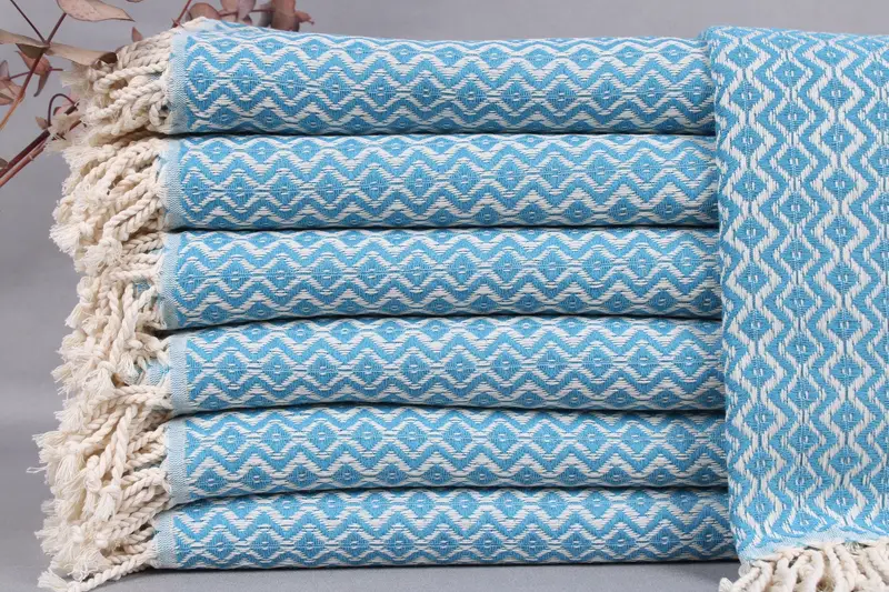 Turkish bath towels are fabricated from organic Turkish cotton, ensuring a high level of absorbency and softness. Resulting in lightweight towels measuring 40x71 inches or 100x180 centimeters, each weighing approximately 400 grams. The weaving process may result in a size tolerance of ±2 inches or 5 centimeters.