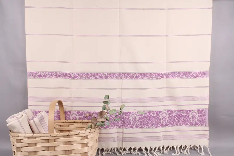These towels are woven from organic Turkish cotton, characterized by high absorbency and durability. Each product measures 40x66 inches or 100x166 centimeters, weighing approximately 295 grams, ensuring a luxurious feel. The hand-woven process results in a tolerance of ± 2 inches or 5 centimeters.