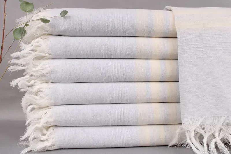 Fiber composition of the Turkish bath towels is characterized by organic Turkish cotton, ensuring superior absorbency and durability. Each towel, blanket, or hand towel measures 40x67 inches or 100x170 centimeters, with a weight of 216 grams. A hand-weaving tolerance of ± 2 inches or 5 centimeters is expected.