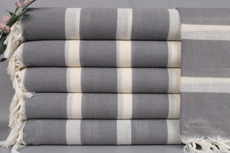 Organic Turkish cotton ensures superior absorbency and quality, characterized by its durability and softness. Each towel, blanket, or hand towel measures 38x71 inches or 95x180 centimeters and weighs 216 grams, with a hand-weaving tolerance of ±2 inches or 5 centimeters. Personalization options include embroidery or name inscriptions, ensuring a unique and bespoke finish.