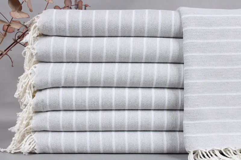 The product features woven towels characterized by Turkish cotton, ensuring superior absorbency and softness. Dimensions specify 40x71 inches or 100x180 centimeters, with a weight of 300 grams. The hand-weaving process results in a tolerance of ±2 inches or 5 centimeters.