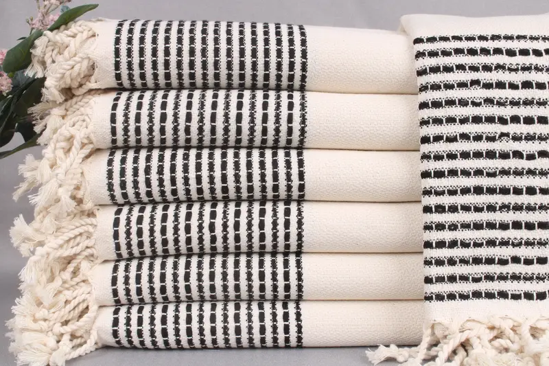 The custom beach towels are woven from organic Turkish cotton, ensuring high absorbency and durability. Each towel, blanket, or hand towel measures 36x69 inches or 90x175 centimeters, with a weight of 460 grams. The hand-weaving process allows for a tolerance of ± 2" or 5cm in dimensions.