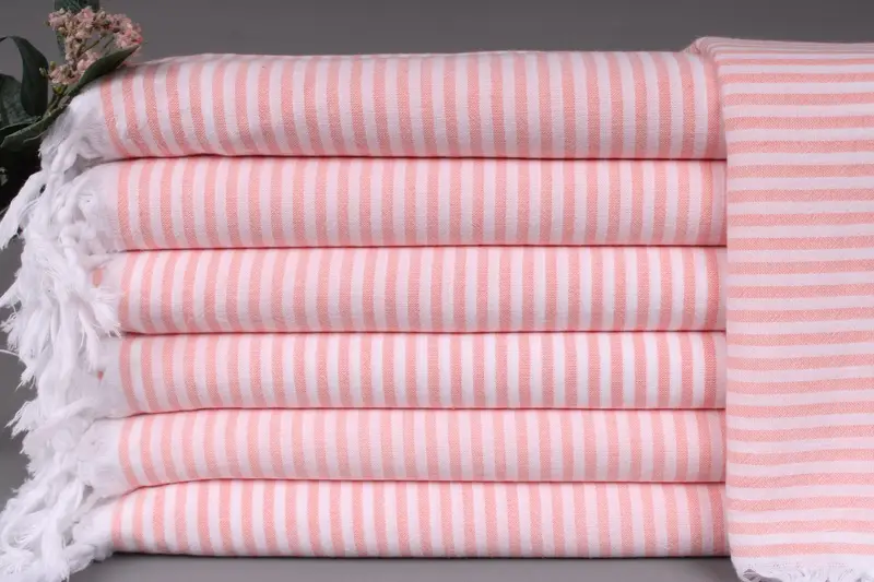 Each Turkish towel is woven from organic Turkish cotton, ensuring a high level of absorbency and durability. Resulting in a product characterized by softness, the towels are meticulously hand-woven on looms, leading to a ± 2 inches (5 cm) tolerance in size and a consistent weight of 200 grams. Customization options include embroidery or name placement with specified letters, fonts, and colors, and personalization can be applied to various products including towels, bedspreads, and tea towels.