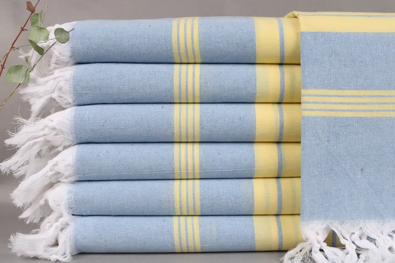 Each Turkish towel is meticulously woven from organic Turkish cotton, ensuring high absorbency and durability. Characterized by its soft texture and lightweight, the towels are washed before first usage to enhance comfort and soften fibers. The towels are subjected to a low temperature wash, enhancing their longevity and maintaining their quality.