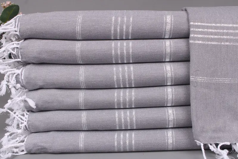 Each Turkish beach towel is woven from organic Turkish cotton on looms, ensuring high quality and absorbency. Characterized by a size of 40x71 inches or 100x180 centimeters, with a tolerance of ± 2 inches or 5 centimeters due to hand-weaving, the towels weigh approximately 260 grams.