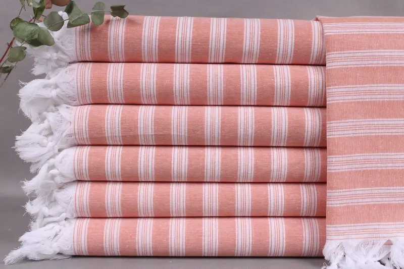 Characterized by woven construction, these beach towels are made from organic Turkish cotton, ensuring high absorbency and durability. Resulting in a uniform 40x71 inches (100x180 centimeters) size, each piece weighs 210 grams, with a tolerance of ± 2 inches or 5 centimeters. The hand-woven technique allows for minor variations.