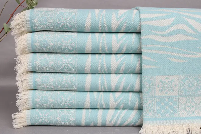 All towels and throws are woven from organic Turkish cotton, ensuring high absorbency and breathability. Resulting in a lightweight yet durable fabric, the dimensions are 20x28 inches or 50x70 centimeters, with a weight of 650 grams. Each item can vary by up to 2 inches or 5 centimeters due to the hand-weaving process.