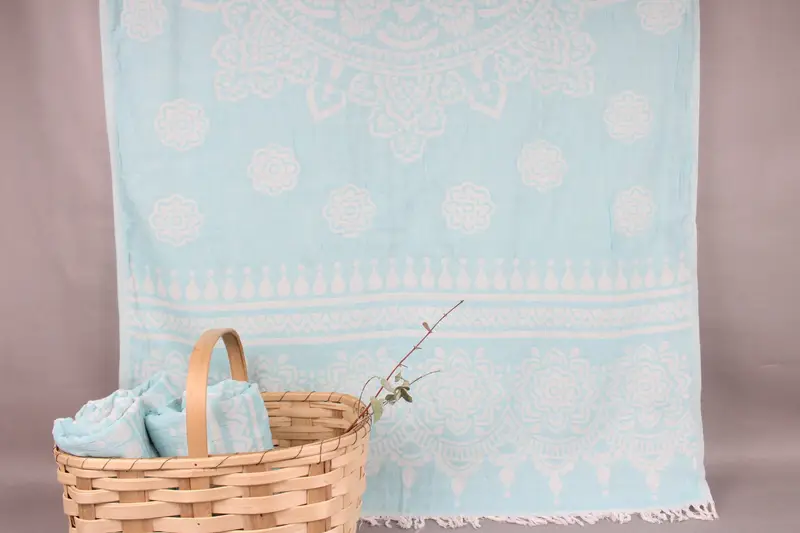 The towels are woven from organic Turkish cotton, ensuring high absorbency and durability. Each piece, measuring 36x73 inches or 90x185 centimeters with a ± 2" or 5cm tolerance, weighs 340 grams. Handwoven on looms, they exhibit slight variations due to manual crafting.