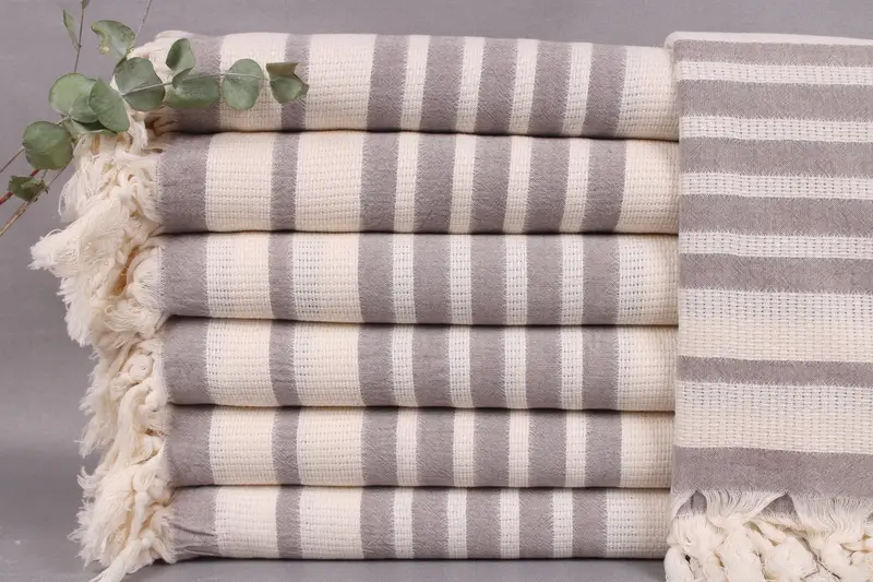These organic cotton towels, bedspreads, and throws are hand-woven on looms, ensuring superior quality. Characterized by their absorbency and craftsmanship, these items are made from 320 grams of organic Turkish cotton, resulting in a lightweight yet durable product. The towels and bedspreads measure 34x71 inches (85x180 centimeters) with a ± 2" (5 cm) tolerance due to hand-weaving.