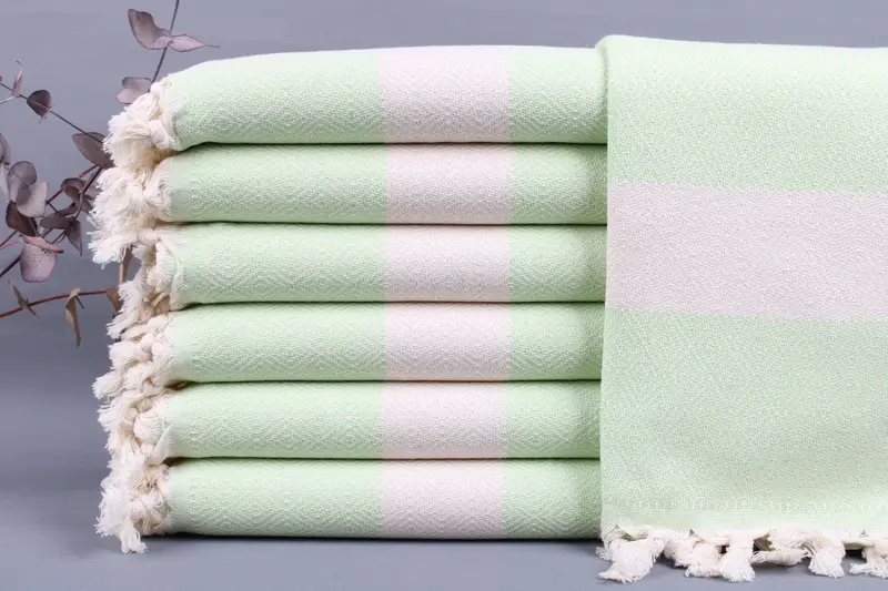 The towels, blankets, and hand towels are characterized by their organic Turkish cotton composition, ensuring durability and high absorbency. Each product is woven from organic Turkish cotton on traditional looms, resulting in handmade items that measure 20x36 inches (50x90 centimeters). The weight is 115 grams, with a weaving tolerance of ± 2 inches (5 cm).