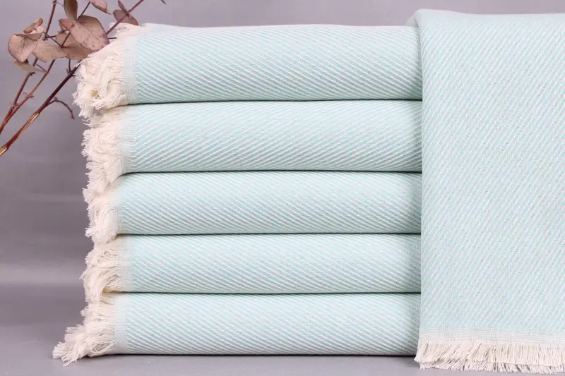 Organic Turkish Cotton fibers are employed, ensuring durability and exceptional absorbency. The towels are meticulously woven by hand, resulting in a product characterized by high-quality craftsmanship. Measuring 36x71 inches or 90x180 centimeters, these towels weigh 420 grams with a manufacturing tolerance of ± 2 inches or 5 centimeters.