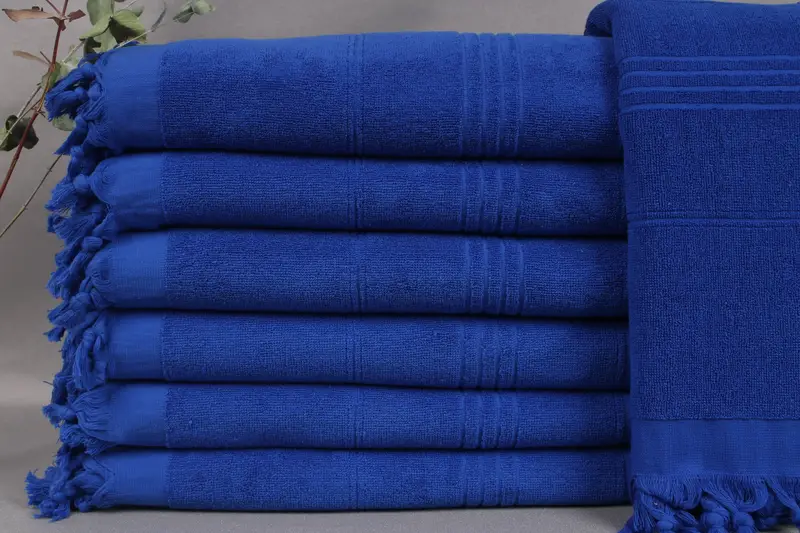 These towels are characterized by their organic Turkish cotton fiber composition, ensuring high absorbency and durability. Each towel measures 36x71 inches or 90x180 centimeters and weighs 400 grams. Hand-woven construction allows for a tolerance of ± 2 inches or 5 centimeters.