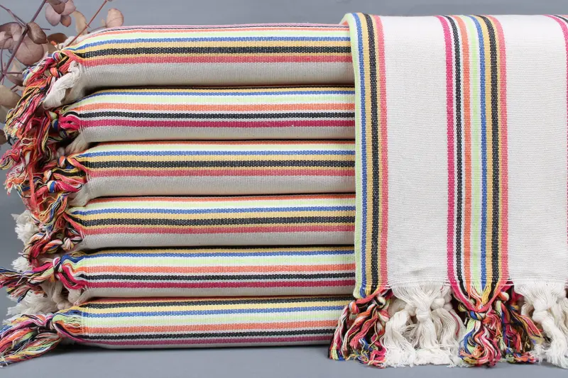 Our Turkish towels, blanket, and throws are woven from organic Turkish cotton, ensuring durability and high absorbency. Characterized by a fiber composition of 100% cotton, these products guarantee optimal water absorption, resulting in a soft and comfortable texture. The dimensions for these items are 40x70 inches or 100x180 centimeters, with a weight range of 425-475 grams. Due to the hand-weaving process, size variations of up to ± 2 inches or 5 centimeters are expected.