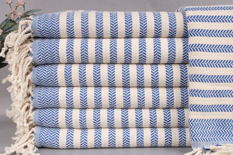 Woven from organic Turkish cotton, these beach towels exhibit a natural fiber composition ensuring enhanced absorbency and durability. Resulting in an ultra-soft texture, each towel is meticulously handcrafted on traditional looms, which is evident in their ± 2" or 5cm variance due to manual weaving techniques. Weighing 440 grams and measuring 40x71 inches or 100x180 centimeters, these towels are designed for multiple uses, be it as beach blankets or yoga towels.