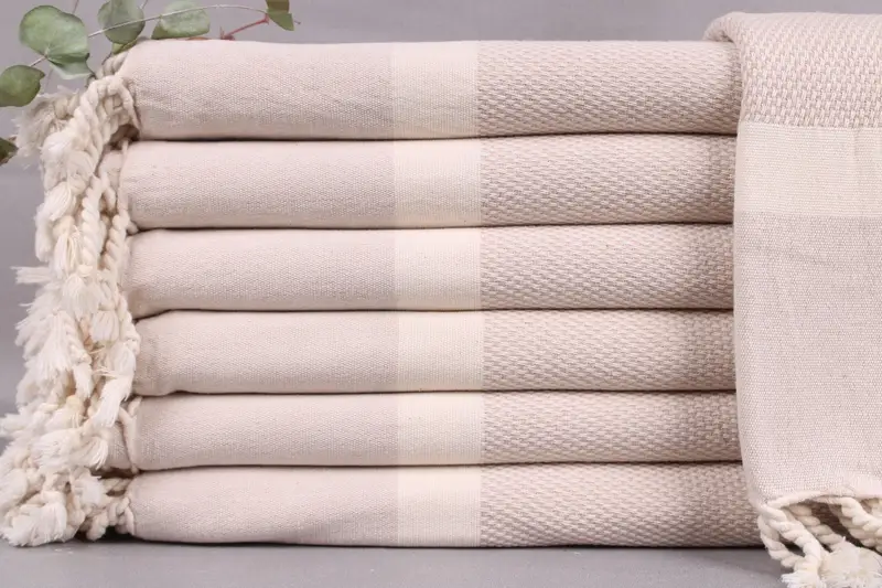 The listed towels are composed of organic Turkish cotton, ensuring superior quality and absorbency. Resulting in a luxury soft texture, the towels are meticulously hand-woven on looms, resulting in a product of high craftsmanship. Measuring 36x67 inches or 90x170 centimeters with a tolerance of ±2 inches or 5 centimeters, each towel weighs approximately 300 grams.