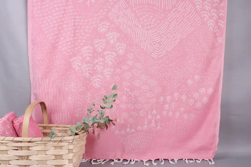 The beach towels are woven from organic Turkish cotton, ensuring quality and sustainability. Characterized by dimensions of 40x71 inches (100x180 cm) and a weight of 260 grams, the towels result in a slight tolerance of ±2 inches or 5 cm in size due to their hand-weaving process.
