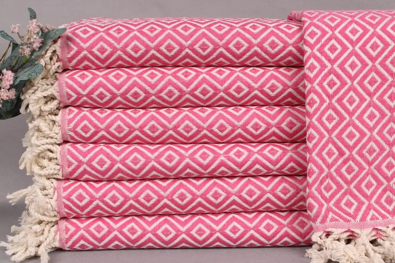 All beach towels, small towels, and throws are woven from organic Turkish cotton on looms, ensuring a sustainable and eco-friendly product. Resulting in a highly absorbent and durable material, these items provide both comfort and longevity. Each piece is handmade, resulting in a unique character with size tolerances of ±2 inches or 5 centimeters.