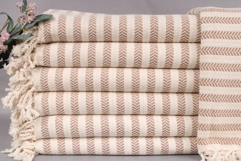 Woven from organic Turkish cotton, these beach towels exhibit exceptional absorbency and durability. Each item is meticulously hand-woven on looms, ensuring a consistent quality and aesthetic. Characterized by a dimension of 40x71 inches or 100x180 centimeters, the towels weigh 440 grams. Their size may vary by ± 2 inches or 5 centimeters due to the weaving process.
