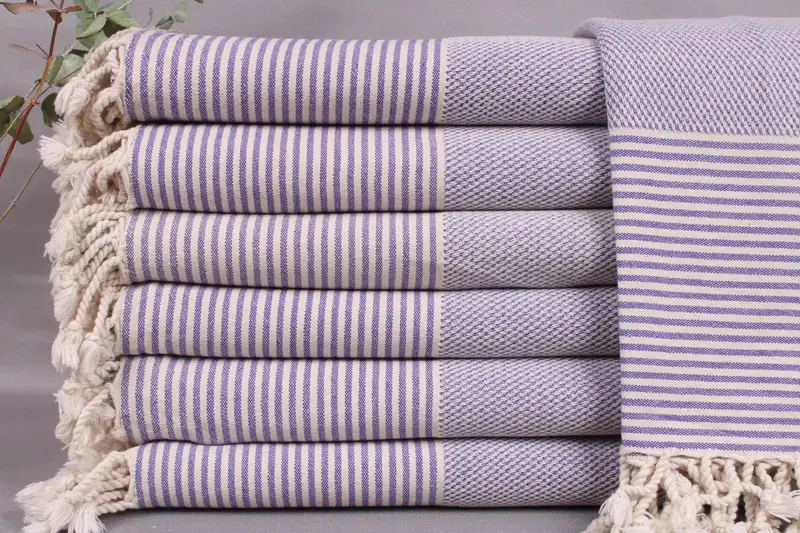 Characterized by high absorbency and durability, these beach towels are woven from Organic Turkish Cotton, ensuring optimal water retention and comfort. Measuring 36x71 inches or 90x180 centimeters, with a tolerance of ±2 inches or 5 centimeters due to hand-weaving, these towels weigh approximately 380 grams.