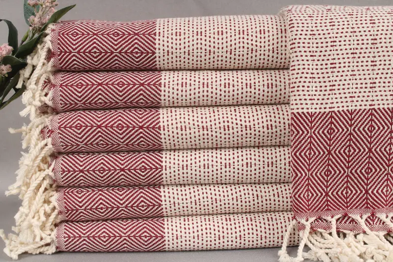 Turkish towels and blankets are woven from organic Turkish cotton, ensuring softness and durability. Characterized by dimensions of 40x71 inches (100x180 cm) and a weight of 380 grams, each piece allows for a weaving tolerance of ±2 inches (±5 cm). Hand-weaving results in slight variations, contributing to the uniqueness of each item.