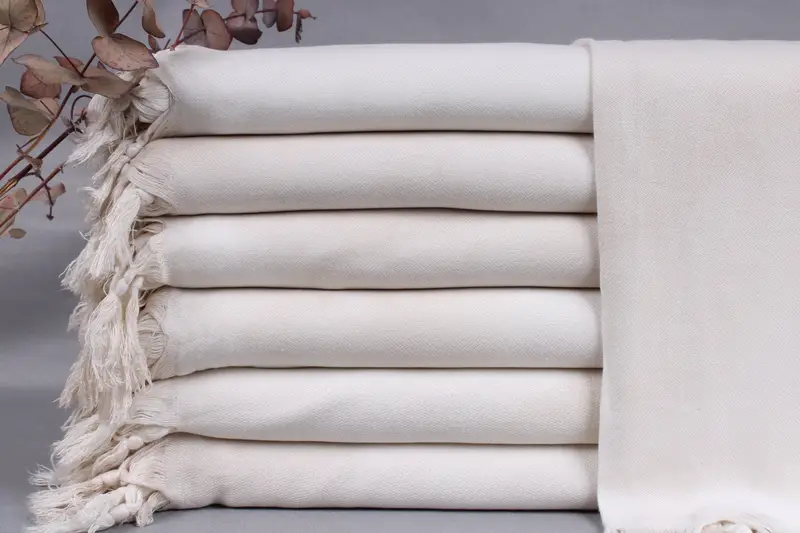 Organic Turkish cotton fibers ensure superior absorbency and durability. The beach towel measures 40x63 inches or 100x160 centimeters, with a weight of 330 grams, and a hand-weaving tolerance of ±2 inches or 5 centimeters. Personalized options are available for towels and blankets, requiring detailed specifications for embroidery or name placement.