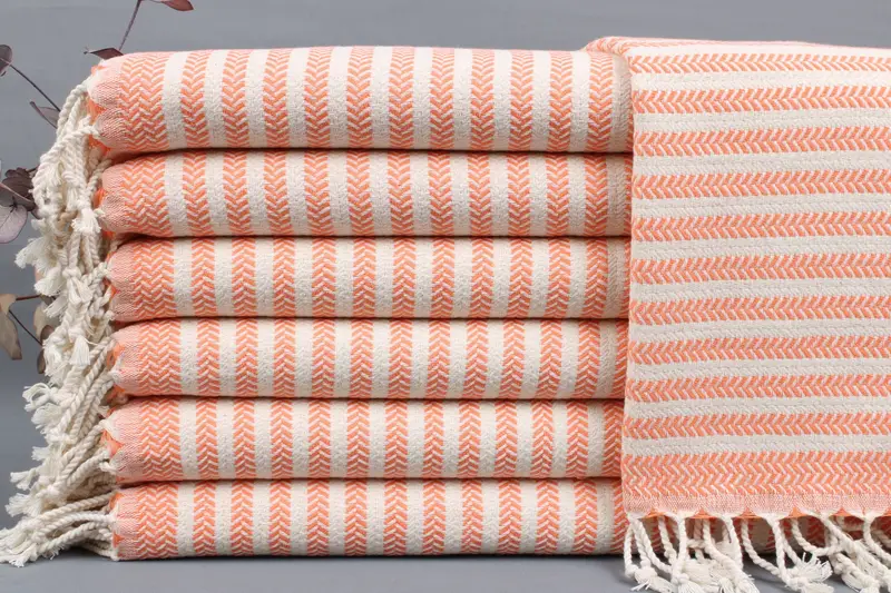Organic Turkish cotton characterizes the towels, ensuring a natural fiber composition that promotes breathability and absorbency. Each towel, measuring 18x40 inches or 45x100 centimeters, weighs 114 grams, and is woven by hand, allowing for a tolerance of ±2 inches or 5 cm due to weaving practices. Personalization options include embroidery, with a recommendation to place designs at the middle of the bottom.