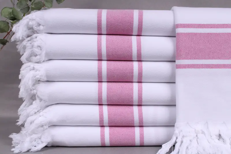 The bath towel is composed of organic Turkish cotton, ensuring high absorbency and comfort. Each towel is woven by hand on looms, resulting in precise dimensions of 40x71 inches or 100x180 centimeters, with a weight of 400 grams. The hand-weaving process allows for a tolerance of ± 2 inches or 5 centimeters.