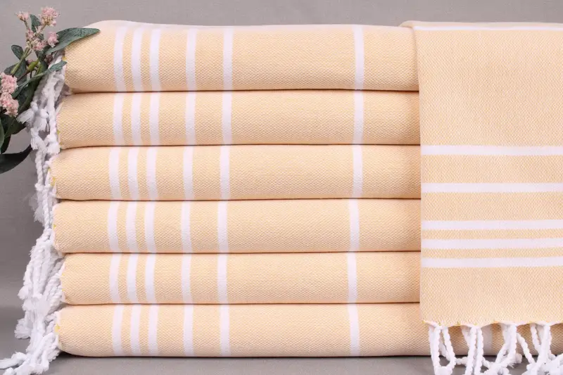 Woven from organic Turkish cotton, these towels are characterized by high absorbency and durability. They are hand-woven on looms, ensuring meticulous craftsmanship. Each towel measures 18x38 inches or 45x95 centimeters, with a weight of 122 grams and size tolerances of ± 2 inches or 5 centimeters.