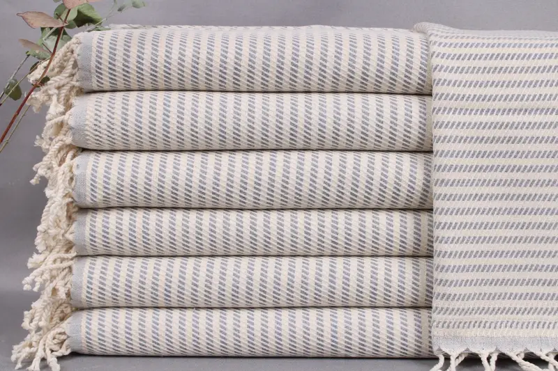 Turkish woven cotton towels, known for their superior absorbency, are meticulously hand-woven on looms to ensure high-quality craftsmanship. Each towel is characterized by its organic Turkish cotton composition, providing durability and softness. The towels are standardized at 20x40 inches or 50x100 centimeters, weighing 122 grams, with a tolerance of ± 2 inches or 5 centimeters due to hand weaving.