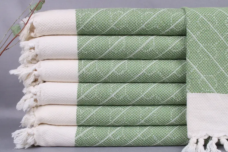 Woven from organic Turkish cotton, the towels feature hand-loomed craftsmanship ensuring durability and quality. Resulting in an 18x36 inches or 45x90 centimeters towel with a tolerance of ±2" or 5cm, the product weighs approximately 120 grams. Characterized by pre-shrunk fabric, these towels require initial washing before use, enhancing their absorbency.