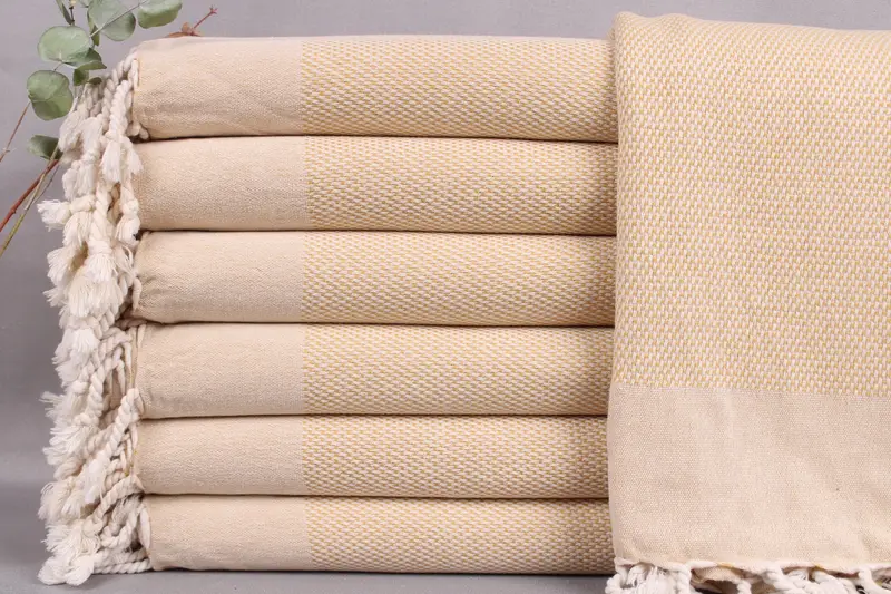 Weaved from organic Turkish cotton, these towels are characterized by their high absorbency, ensuring optimal water retention. They measure 40x71 inches or 100x180 centimeters and have a weight of 390 grams. Hand weaving tolerances are ±2 inches or 5 centimeters.