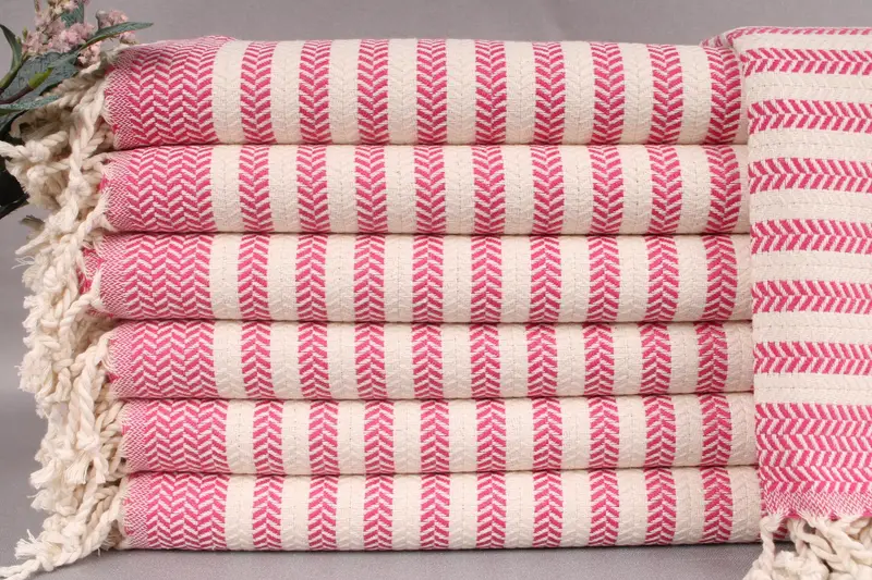 Each beach towel is woven from organic Turkish cotton, ensuring superior absorbency and durability. The towels are sized at 40x71 inches or 100x180 centimeters, weighing 440 grams, with a weaving tolerance of ±2 inches or 5 centimeters. Customization options include embroidery or personalization with letters, names, or logos, allowing for tailored placement and color choices.