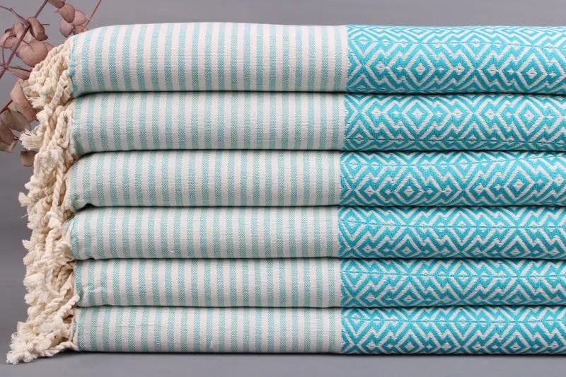 Organic Turkish cotton products, ensuring superior absorbency and durability, result in soft and cozy textiles suitable for various applications. Each towel or blanket is characterized by dimensions of 40x70 inches or 100x180 cm, with a weight ranging from 425 to 475 grams. Hand-woven with a tolerance of ± 2 inches or 5 cm, these items maintain consistent quality despite minor variations.