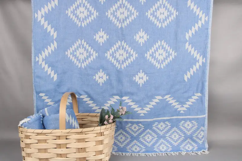 All beach towels are woven from organic Turkish cotton on traditional looms, ensuring superior absorbency and durability. Each towel is characterized by a dimension of 36x71 inches or 90x180 centimeters, with a weight of 320 grams per piece. Hand-weaving tolerances allow for a variance of up to ±2 inches or 5 centimeters.