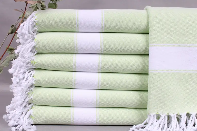 Organic Turkish Cotton characterizes the towels, providing high absorbency and durability. Each item measures 40x71 inches or 100x180 centimeters, weighing approximately 400 grams. Weaving tolerances are ± 2 inches or 5 centimeters.