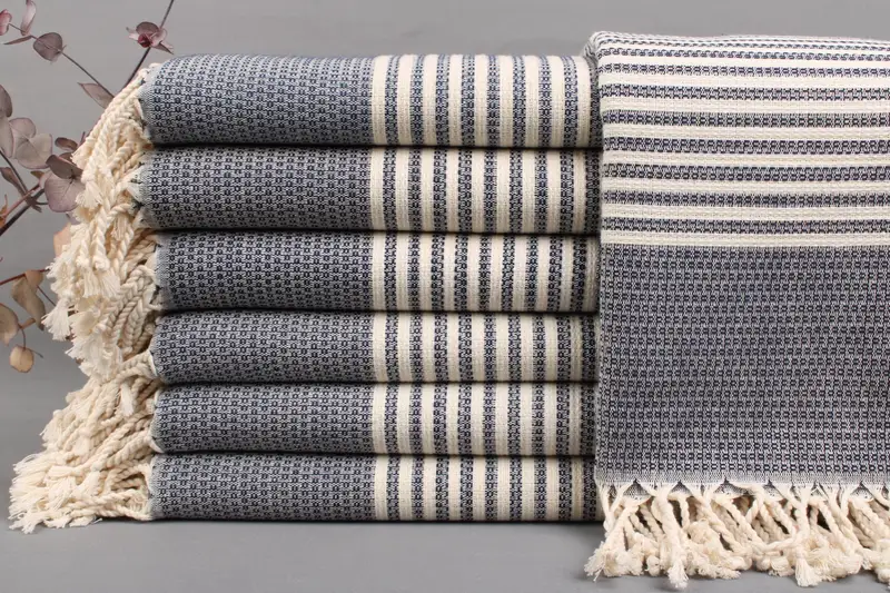 Our organic towels and throws are woven from Turkish cotton, ensuring superior absorbency and durability. The specified dimensions of 40x70 inches or 100x180 centimeters ensure versatile utility across various uses. Each item exhibits a tolerance of ± 2 inches or 5 centimeters due to manual weaving, maintaining consistent quality.
