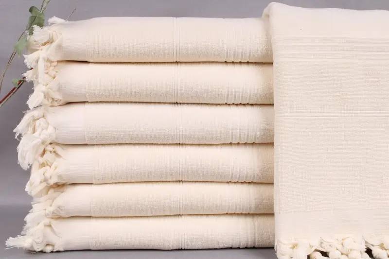 Organic Turkish cotton is the primary fiber composition, ensuring high-quality absorbency. Characterized by a subcategory of wedding gifts, secondary color beige, these towels range from 36x71 inches or 90x180 centimeters, weighing approximately 400 grams. Hand weaving results in a tolerance of ±2 inches or 5cm.