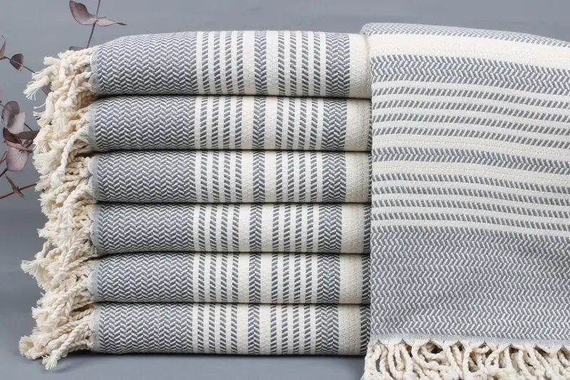 The Turkish towels, blankets, and throws are woven from organic Turkish cotton, ensuring high absorbency and durability. Each piece measures 40x71 inches or 100x180 centimeters, weighing approximately 420 grams, with a tolerance of ± 2 inches or 5 centimeters due to hand-weaving techniques. Customization is available through embroidery or lettering on the towels and blankets, with options for personal text placement and font selection.