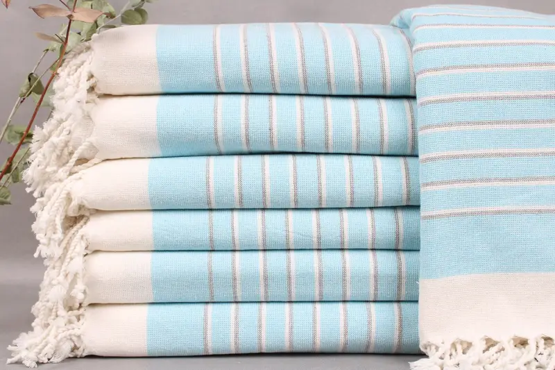 Turkish towels are characterized by their hand-weaving technique using organic Turkish cotton, ensuring high-quality and durability. Each piece is woven on looms and measures precisely 39x65 inches, translating to 98x165 centimeters, with a tolerance of ± 2 inches or 5 centimeters due to the hand-weaving process. Weighing 406 grams, these towels offer a soft and absorbent experience, becoming softer with each wash.