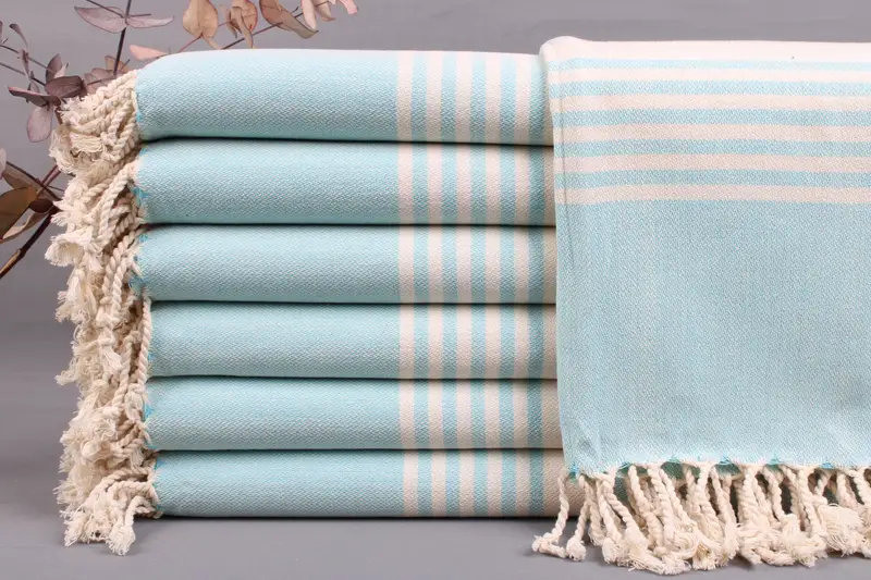 Turkish towels, woven from organic Turkish cotton, are characterized by high absorbency and durability. Each piece, including beach towels, bedspreads, and hand towels, is meticulously hand-woven on traditional looms, ensuring superior quality. These towels typically measure 40x70 inches or 100x180 centimeters, with a weight range of 425-475 grams. There is an acceptable tolerance of ± 2 inches or 5 centimeters due to the manual weaving process.