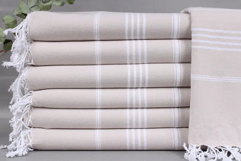 Turkish towels are woven from organic Turkish cotton, ensuring high-quality fiber composition and excellent absorbency. Characterized by hand-weaving, each product measures 40x71 inches or 100x180 centimeters, weighing 290 grams. Tolerances in dimensions are ± 2 inches or 5 centimeters due to the weaving process.