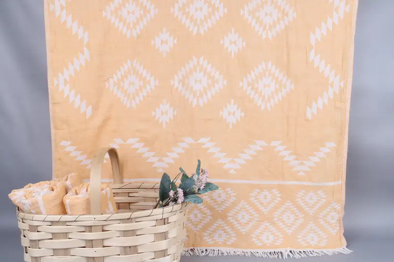 Organic Turkish cotton characterizes the towels, ensuring superior absorbency and softness. Resulting in a luxurious hand-feel, these towels are woven by hand on looms. Dimensions are 36x71 inches or 90x180 centimeters, with a tolerance of ±2 inches or 5 centimeters due to the hand-weaving process. Each piece weighs 320 grams.