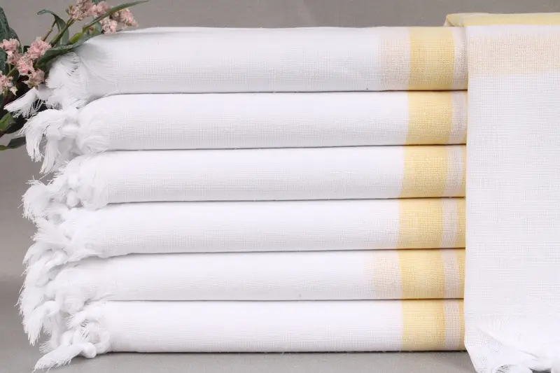 Weaved from organic Turkish cotton, the towels ensure a premium hand-feeling and excellent absorbency. Resulting in a lightweight yet durable product, each piece weighs approximately 220 grams. Dimensions are specified as 40x71 inches or 100x180 centimeters, with potential variations of ± 2 inches (5 cm) due to hand-weaving tolerances.