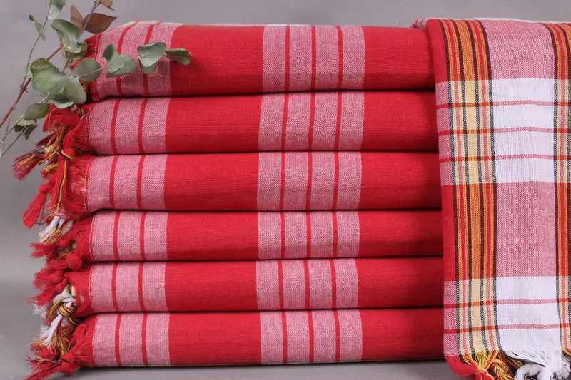 The towels are woven from organic Turkish cotton, ensuring high quality and soft texture. Each piece is characterized by a 32x71 inches dimension, translating to 80x180 centimeters. Weighing approximately 250 grams, they feature hand-weaving tolerances of ±2 inches or 5 centimeters.